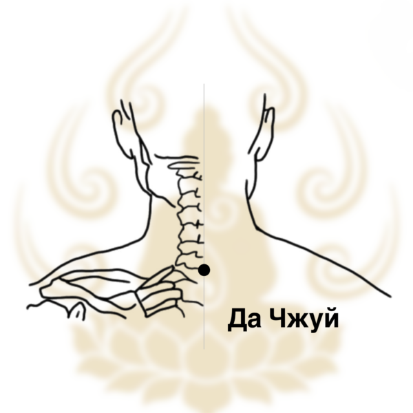 Точка Да Чжуй расположена чуть ниже остистого отростка седьмого шейного позвонка — над остистым отростком первого грудного.