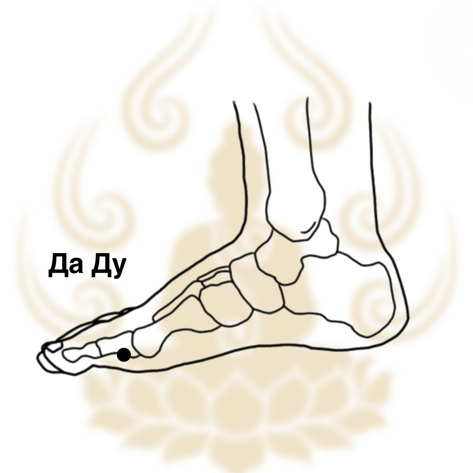 Точка Да Ду находится на стопе. Анатомически она расположена на внутренней стороне стопы, в углублении кпереди и книзу от первого плюснефалангового сустава, на границе тыльной и подошвенной поверхностей кожи. Более конкретно — во впадине у основания большого пальца стопы, где заканчивается складка, образующаяся при сгибании пальца.