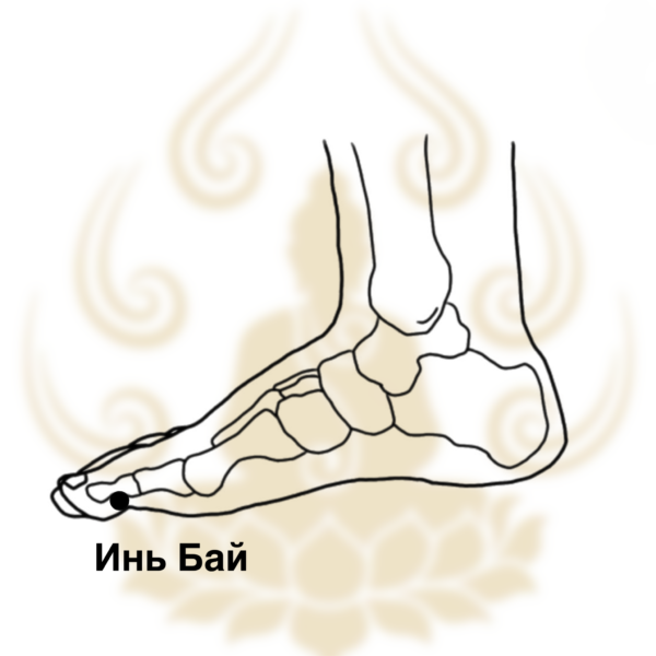 Точка Инь Бай расположена на внутренней (медиальной) стороне большого пальца стопы. Она находится примерно на 0.1 цуня кнутри от угла ногтевого ложа большого пальца, в месте перехода кожи в ноготь.
