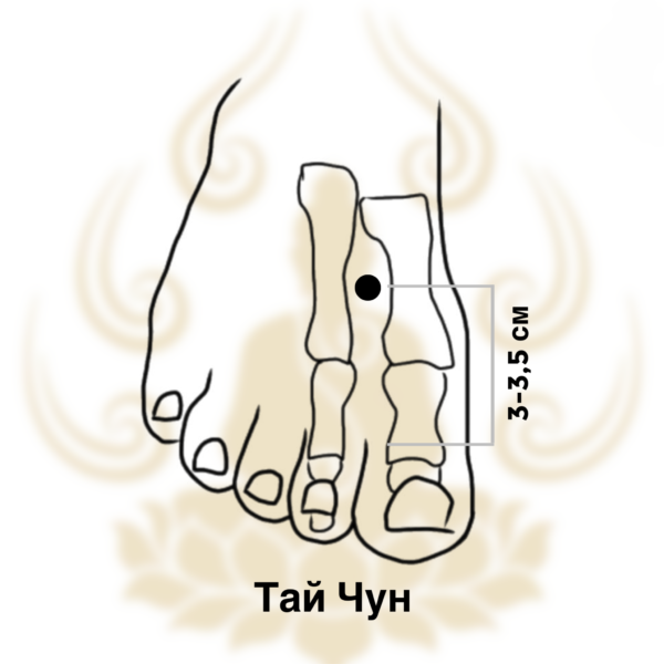 Другим методом является исходить из пульса на артерии тыла стопы, которая ровно через место нахождения Тай Чун. Поэтому достаточно нащупать пульс в области углубления между I и II плюсневыми костями.
