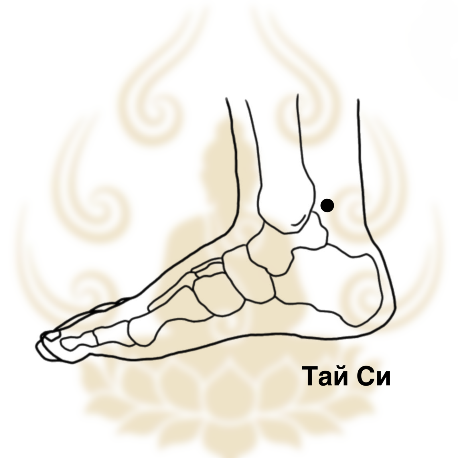 Точка Тай Си расположена на внутренней стороне стопы, в области голеностопного сустава. Она находится в углублении посередине между самой выступающей точкой внутренней лодыжки (медиальной лодыжкой) и пяточным (ахилловым) сухожилием, на уровне её центра.