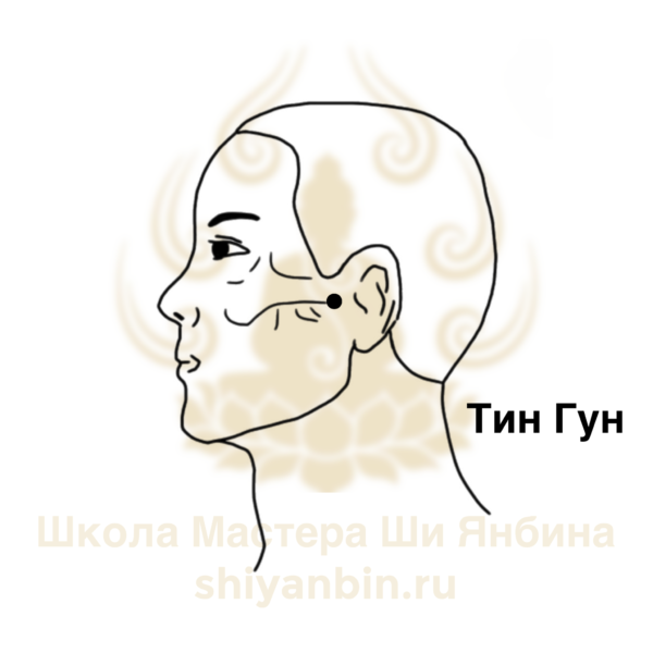 Точка Тин Гун находится на лице, в области ушной раковины. Анатомически она расположена в углублении перед козелком уха, на уровне козелка, между нижнечелюстным суставом и наружным слуховым проходом. Точка локализуется во впадине, которая хорошо прощупывается при открывании рта, сразу за задним краем височно-нижнечелюстного сустава. При открывании рта в этом месте образуется естественное углубление.