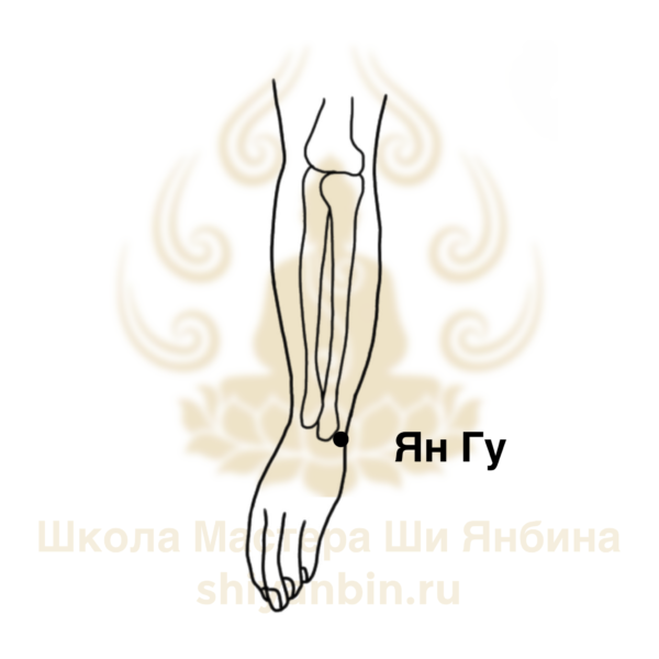 Точка Ян Гу находится на тыльной стороне запястья. Анатомически она расположена между шиловидным отростком локтевой кости и трехгранной костью, во впадине, которая хорошо прощупывается при полусогнутой в лучезапястном суставе руке. Топографическая анатомия: в этой области проходят тыльная запястная ветвь локтевой артерии, тыльные ветви локтевого нерва, а также медиальный кожный нерв предплечья.